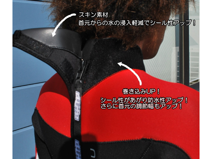 首周りは、スキン素材を採用し、巻き込む部分を大きくし、水の浸入を最小限に