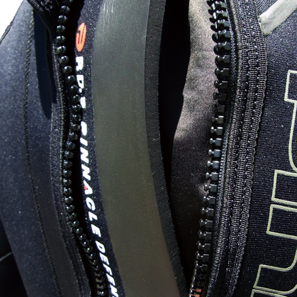 10mm厚のプロテクターが背骨を衝撃から守るだけでなく、背中にできる空洞をうめ水が浸入を最小限にくいとめます。